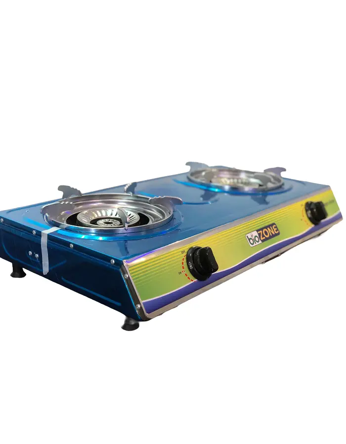Our Bio gas double burner is deep blue color option with after sale service provided, warranty coverage offered with a stainless steel material used in kitchen and general household, powered through home bio gas and boosted by our Methanoboost-BFB enzymes for better usage, available in Kenya and East Africa.
